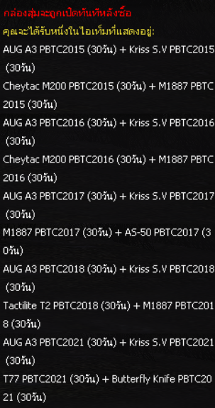 กล่องสุ่ม PBTC Series Gacha ระยะเวลาเปิดจำหน่ายตั้งแต่วันที่ : 11 - 24 มีนาคม (ไอเทมจะทำการเปิดจำหน่ายจนถึงระยะเวลาก่อนปิดปรับปรุงเซิร์ฟเวอร์)