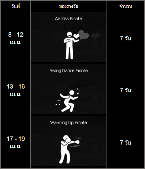 เพียงล็อกอินรายวัน รับท่า EMOTE ออกท่าทาง แสดงอารมณ์ให้สุดสมันส์ตลอดสงกรานต์ ตามวันที่กำหนดดังนี้