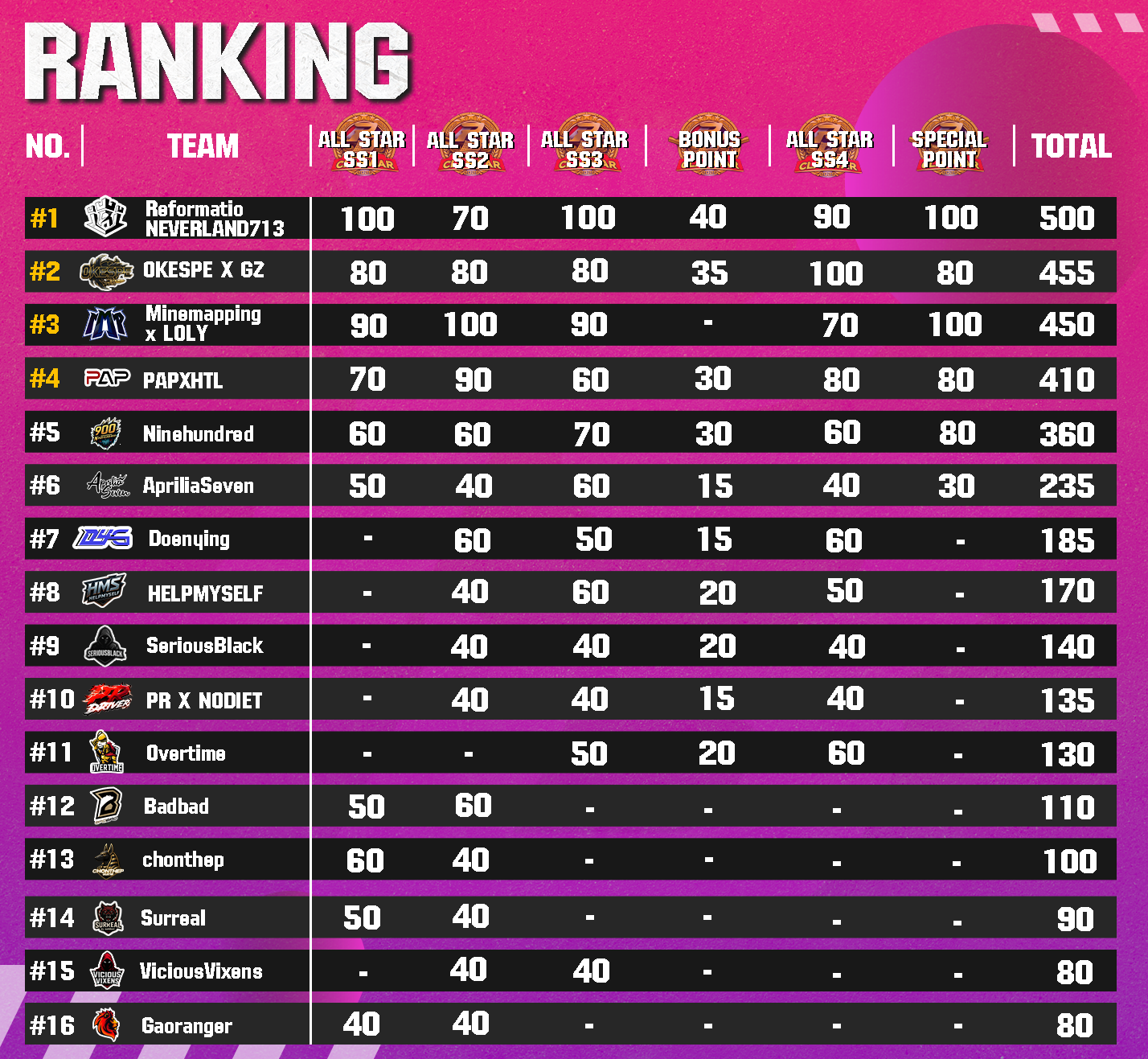 Pointblank E-sport 2025 Leader Board ตารางคะแนนในการแข่งขัน Pointblank ทีมที่มีคะแนนรวมทั้ง 4 ซีซั่น อันดับ 1 ถึงอันดับ 4 จะได้สิทธิ์เป็นเข้าร่วมการแข่งขันออฟไลน์ในงาน PBNC 2025 ทันที!! หมายเหตุ : คะแนนพิเศษจะนับหลังจบซีซั่น 4 กฎและเงื่อนไขในการเปลี่ยนแปลงสมาชิกทีมและชื่อทีมสำหรับการแข่งขันปี 2025 เพื่อให้การแข่งขันเป็นไปตามระเบียบและรักษาความยุติธรรม ทางทีมงานขอแจ้งแนวทางการเปลี่ยนแปลงสมาชิกในทีมและชื่อทีม ดังนี้ 1.การเปลี่ยนแปลงสมาชิกในทีม 🔘 ทุกครั้งที่มีการเปลี่ยนแปลงสมาชิกในทีม จะต้องแจ้งให้ทีมงานทราบล่วงหน้า ผ่านอีเมล e-sports@zepetto.co.th 🔘 ตลอดทั้ง 4 ซีซั่นของการแข่งขัน แต่ละทีมสามารถเปลี่ยนแปลงสมาชิกได้สูงสุด 3 คน (รวมตัวสำรอง) 🔘หากทีมมีการเปลี่ยนแปลงสมาชิกเกิน 3 คน ทางทีมงานจะถือว่าทีมนั้นเป็น ทีมใหม่ และคะแนนสะสมทั้งหมดจะถูกรีเซ็ตเป็น 0โดยจะเริ่มนับคะแนนใหม่ตั้งแต่การแข่งขันรอบถัดไป 🔘ทีมงานจะประกาศช่วงเวลาที่สามารถแจ้งเปลี่ยนแปลงสมาชิกได้ในแต่ละซีซั่น กรุณาติดตามข่าวสารจากช่องทาง ดิสคอร์ด 2.การเปลี่ยนชื่อทีม 🔘 เนื่องจากการแข่งขันปี 2025 จะใช้รูปแบบการแข่งขัน ในระดับแคลน ดังนั้น ชื่อทีมจะต้องตรงกับชื่อแคลน ที่ใช้ลงทะเบียนแข่งขัน 🔘 หากต้องการเปลี่ยนชื่อทีม หัวหน้าทีมจะต้องเป็นผู้แจ้งเรื่องมายังทีมงาน ผ่านอีเมล e-sports@zepetto.co.th 🔘 หัวข้ออีเมลต้องระบุชัดเจน ว่าเป็นการขอเปลี่ยนชื่อทีม พร้อมแจ้งชื่อรายการแข่งขัน 🔘 ทีมงานจะประกาศช่วงเวลาที่สามารถแจ้งเปลี่ยนแปลงชื่อทีมได้ในแต่ละซีซั่น |