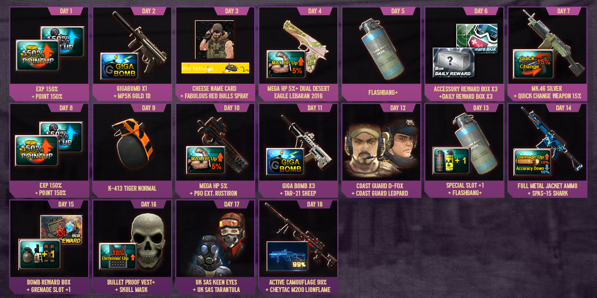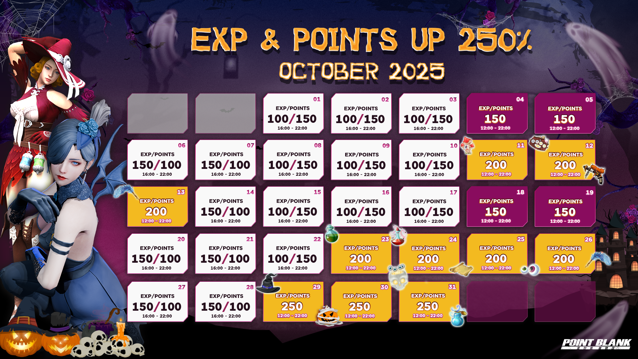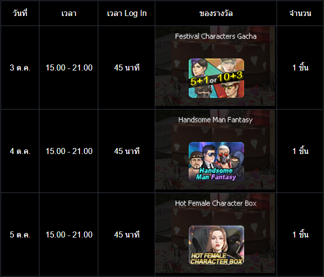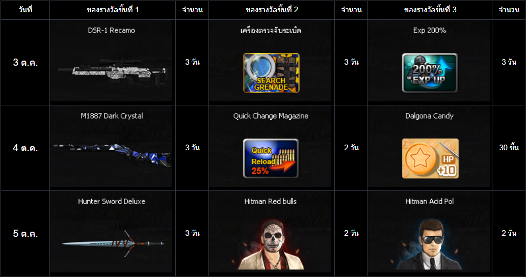 POINT BLANK WEEKLY EVENT UPDATE อัปเดตประจำวันที่ 1 ตุลาคม 2568 ไฮไลท์อัปเดตประจำสัปดาห์ 1. รีบจับจอง! Battle Pass: Astel Idol สเตจกล้าท้าฝัน ให้ทุกท่านได้สัมผัส เป็นสัปดาห์สุดท้าย! ดูรายละเอียดเพิ่มเติมได้ที่นี่ 4. เริ่ม กิจกรรม Pirate Ticket Collection สะสม Ticket รับไอเทมมากมายฟรี! ดูรายละเอียดเพิ่มเติมที่นี่ กิจกรรมใหม่ภายในเกม อัปเดต กิจกรรม การ์ดภารกิจ Grave! (1 - 21 ตุลาคม 2568) อัปเดต กิจกรรม ล็อกอินรับไอเทมสุดสัปดาห์ (3 - 5 ตุลาคม 2568) อัปเดต กิจกรรม สะสมเวลาล็อกอินสุดสัปดาห์เดือนตุลาคม (3 - 5 ตุลาคม 2568) อัปเดต กิจกรรม ล็อกอินต่อเนื่อง ประจำเดือนตุลาคม (1 - 20 ตุลาคม 2568) กิจกรรมที่กำลังดำเนินอยู่ภายในเกม กิจกรรม แจกของรางวัลต้อนรับผู้เล่นใหม่! (17 กันยายน - 7 ตุลาคม 2568) กิจกรรม ล็อกอินรับไอเทมประจำวัน! (17 กันยายน - 7 ตุลาคม 2568) ![]() Demon Hunter ซีรีส์ ระยะเวลาเปิดจำหน่ายตั้งแต่วันที่ : 1 - 7 ตุลาคม 2568 (ไอเทมจะทำการเปิดจำหน่ายจนถึงระยะเวลาก่อนปิดปรับปรุงเซิร์ฟเวอร์) "พิเศษโบนัส 150% EXP & Point เมื่อใช้อาวุธหลักของซีรีส์" ![]() ![]() ![]() ![]() กล่องสุ่ม Arcade Gacha V2 ระยะเวลาเปิดจำหน่ายตั้งแต่วันที่ : 1 - 14 ตุลาคม 2568 (ไอเทมจะทำการเปิดจำหน่ายจนถึงระยะเวลาก่อนปิดปรับปรุงเซิร์ฟเวอร์) *ภาพแสดงไอเทมเพียงบางส่วนผู้เล่นสามารถตรวจสอบของราววัลทั้งหมดได้จากร้านค้าภายในเกม เซ็ต AUG HBAR Element Nature Pack 7D ระยะเวลาเปิดจำหน่ายตั้งแต่วันที่ : 1 - 14 ตุลาคม 2568 (ไอเทมจะทำการเปิดจำหน่ายจนถึงระยะเวลาก่อนปิดปรับปรุงเซิร์ฟเวอร์) ![]() กิจกรรม แจกของรางวัลต้อนรับผู้เล่นใหม่! ระยะเวลากิจกรรม : 17 กันยายน - 7 ตุลาคม 2568 ทั้งนี้ยังมีกิจกรรมต้อนรับปิดเทอมอีกมากมาย รายละเอียดเพิ่มเติม: คลิกที่นี่ ![]() กิจกรรม ล็อกอินรับไอเทมประจำวัน! ระยะเวลากิจกรรม : 17 กันยายน - 7 ตุลาคม 2568 เพียงเข้าเกมในช่วง "ระยะเวลากิจกรรม" เพื่อรับของรางวัลตามรายการ ดังนี้ * ไอเทมทุกชิ้นจากกิจกรรมจะมีอายุการใช้งาน 1 วัน* **ไอเทมจะถูกเปิดใช้งานทันทีเมื่อเข้าตัวหรืออยู่ในคลังอาวุธของผู้เล่น** การ์ดภารกิจ Grave! ระยะเวลากิจกรรม : 1 - 21 ตุลาคม 2568 พบกับ การ์ดภารกิจประจำเดือนสิงหาคม มาพร้อมกับไอเทมมากมาย ดังนี้ รางวัลต่างๆที่สามารถรับได้จากบัตรภารกิจ การ์ดภารกิจ Grave! เมื่อทำ Mission card ครบทุกใบสำเร็จ รับไปเลย Pirate Token สามารถตรวจสอบรายละเอียดภารกิจและของรางวัลต่างได้ที่นี่ คลิก > Ticket Collection กิจกรรม ล็อกอินพิเศษสุดสัปดาห์ ระยะเวลากิจกรรม : 3 - 5 ตุลาคม 2568 เพียงเข้าเกมในช่วงสุดสัปดาห์ เพื่อรับของรางวัลสุดพิเศษตามรายการ ดังนี้ ======================= กิจกรรม สะสมเวลาล็อกอินสุดสัปดาห์ประจำเดือนตุลาคม 2568 ระยะเวลากิจกรรม : 3 - 5 ตุลาคม 2568 เพียงเข้าเกมและสะสมเวลาออนไลน์ให้ครบตามที่กำหนด