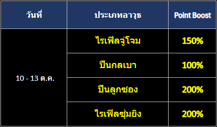 - ผู้เล่นที่ได้ทำการเล่นอาวุธตามประเภทที่กำหนดจะได้รับ Point เพิ่มเติม สูงสุดถึง 200%