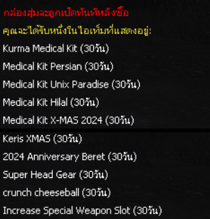1. *หมายเหตุ ผู้เล่นมีโอกาสรับของรางวัลตามภาพ โดยทุกไอเทมที่ได้รับ จะมีจำนวน 30 / 7 / 3 / 1 วัน