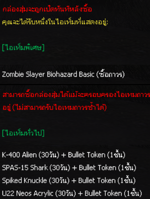** ผู้เล่นที่มี Zombie Slayer Biohazard Basic (Durability) อยู่แล้วในช่วงเวลาการขายกล่องสุ่ม