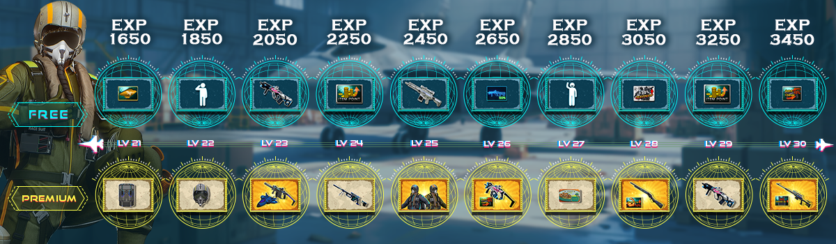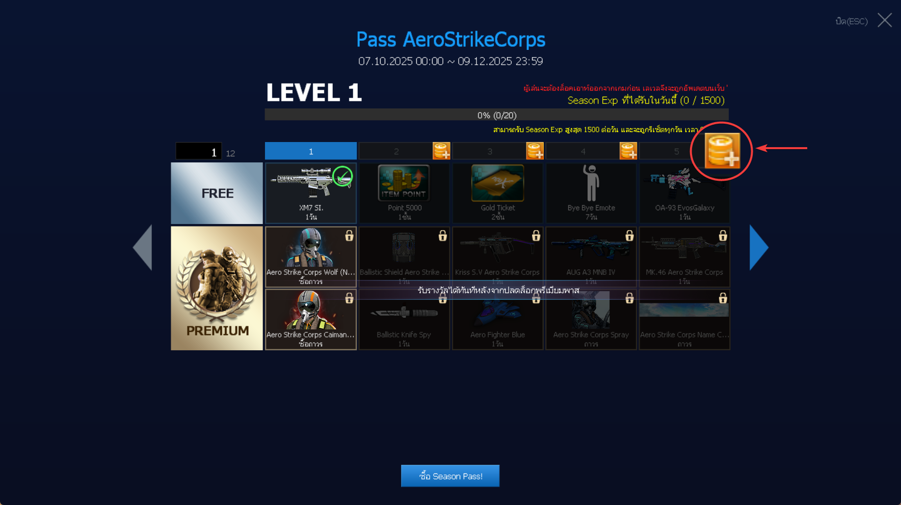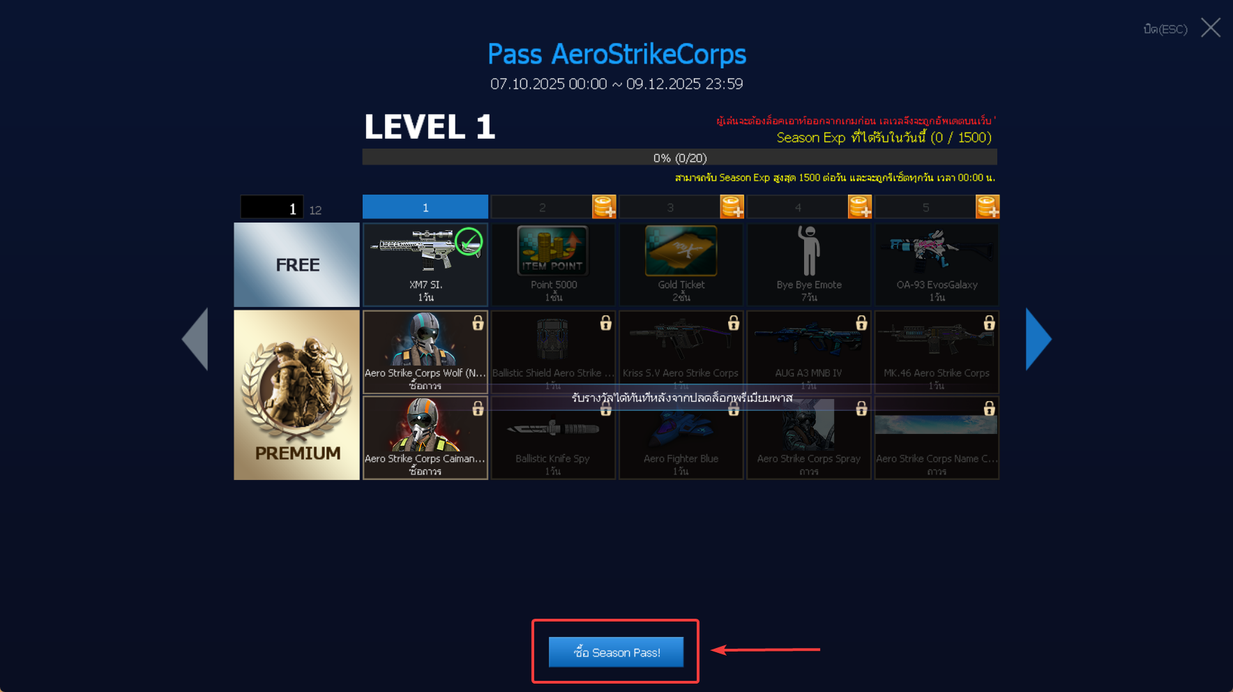Battle Pass : Aero Strike Corps ระยะเวลาแบทเทิลพาส: 22 ตุลาคม - 10 ธันวาคม 2568 เงื่อนไขเข้าร่วม Battle Pass 1. สะสม Season EXP ตามที่กำหนดเพื่อปลดล็อกระดับ Battle Pass เพื่อเพิ่มรางวัลพรีเมี่ยมของคุณ 2. ยิ่งระดับ Battle Pass สูงเท่าไร ก็จะยิ่งได้รับของพรีเมี่ยมมากขึ้นเท่านั้น 3. ผู้เล่นทุกคนสามารถได้รับของรางวัลจาก Battle Pass ได้ฟรีที่ช่องของรางวัลแถบ Free Reward 4. สำหรับรางวัลพรีเมียม ผู้เล่นจะต้องปลดล็อกด้วย 18,000 PB Cash เพื่อรับรางวัลพรีเมี่ยมอีกมากมาย!!! 5. Season EXP จากแมตช์ปกติจะถูกจำกัดอยู่ที่ 1,500 EXP ต่อวัน ( รีเซ็ตเวลา 00.00 น. ) 6. เมื่อระยะเวลา Battle Pass สิ้นสุดลง ผู้เล่นทุกคนจะไม่สามารถเพิ่มเลเวล Battle Pass ได้ 7. เมื่อผู้เล่นถึงระดับ Battle Pass ที่กำหนด ร้านค้าจะปลดล็อกไอเทมหายากใน Battle Pass Premium Shop คู่มือปลดล็อกของรางวัลพรีเมียม ![]() เงื่อนไขการอัพเลเวล Battle Pass การอัพเลเวล Battle Pass สามารถรับได้ทั้งหมด 3 วิธี ดังนี้ 1. จากการเข้าเล่นเกมปกติ โดยจะได้รับ Season Pass EXP ซึ่งเป็นจำนวน 10% ของ EXP ที่ได้รับจากการเล่นเกม แต่ละแมทช์