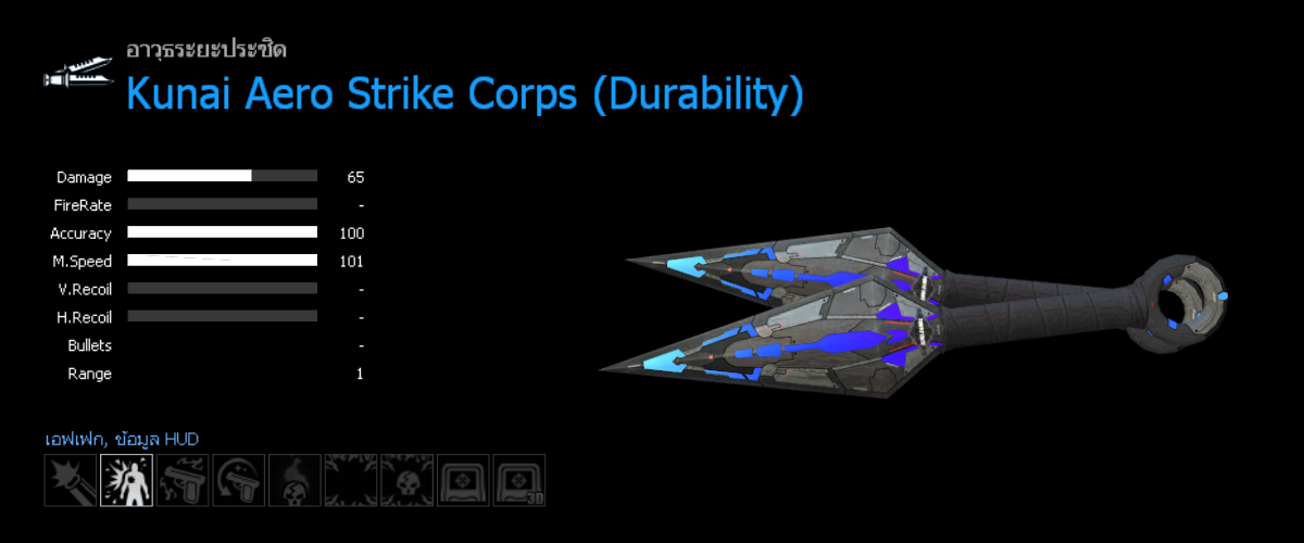 อาวุธประชิด : Kunai Aero Strike Corps (ถาวร) - แบบถาวรและแบบจำกัดเวลา สามารถสุ่มได้จาก Random Box (การันตีถาวร 100%) เงื่อนไขการครอบครอง: ของรางวัลระดับ Premium ที่ Battle pass เลเวล 40