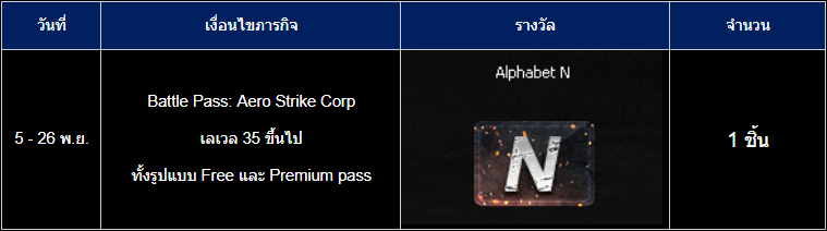 • คำอธิบายกิจกรรม - ทำการเก็บเลเวล Battle Pass (Free และ Premium Pass) ให้ถึงเลเวล 35 เพื่อรับของรางวัลและตัวอักษร Alphabet ดังนี้