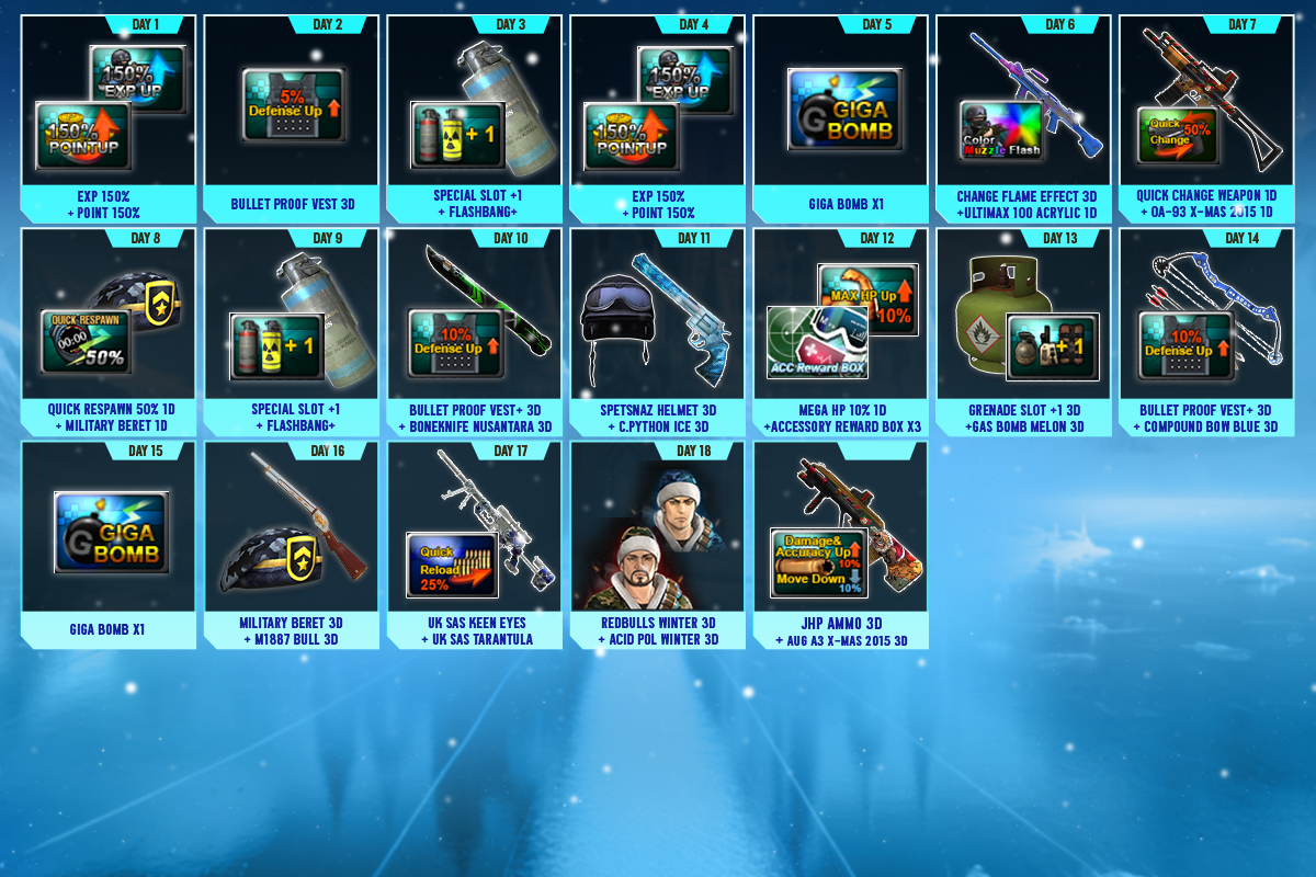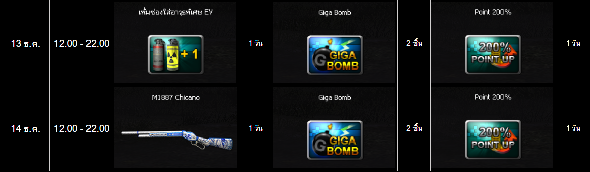 - รับ ไอเทม Giga Bomb สุดสัปดาห์ผ่านผ่านกิจกรรม "ล็อกอินรับไอเทมวันหยุดพิเศษ!" (10 - 14 ธันวาคม)