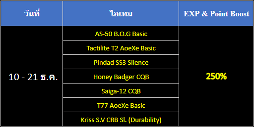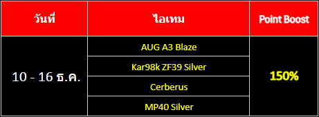 - บูสแต้ม Point สูงสุด 150% เมื่อเล่นอาวุธหลักประจำ *Point Item Sale (10 - 30 ธันวาคม)
