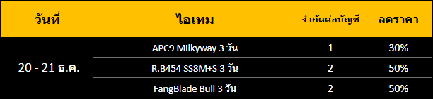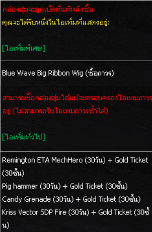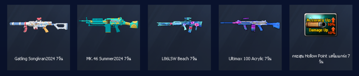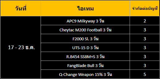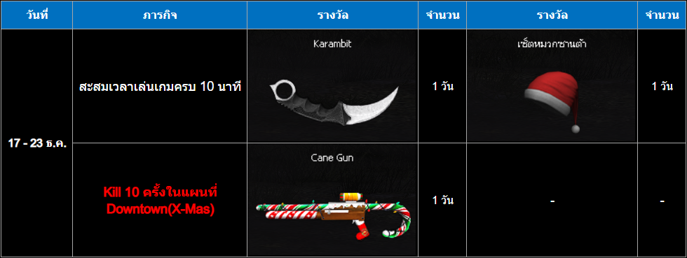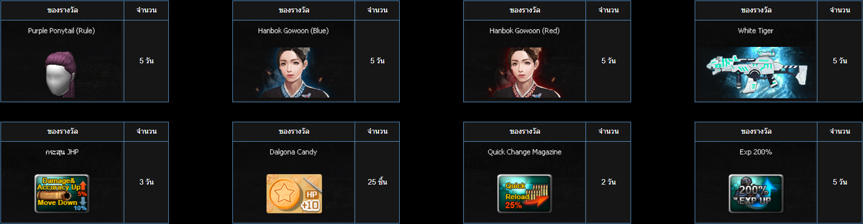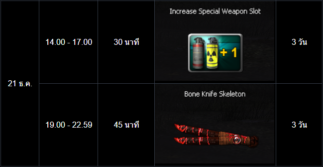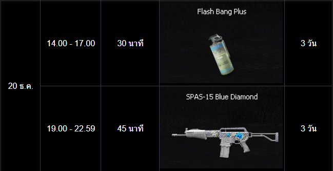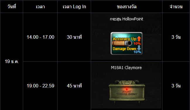 * ไอเทมทุกชิ้นจากกิจกรรมจะมีอายุการใช้งาน 1 วัน * **ไอเทมจะถูกเปิดใช้งานทันทีเมื่อเข้าตัวหรืออยู่ในคลังอาวุธของผู้เล่น**