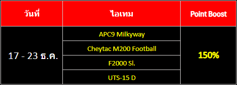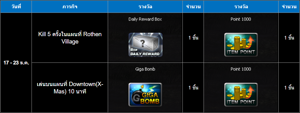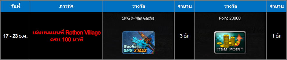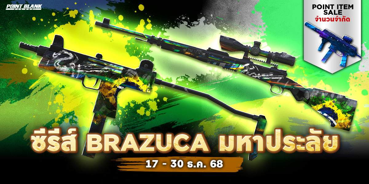 POINT BLANK WEEKLY EVENT UPDATE อัปเดตประจำวันที่ 17 ธันวาคม 2568 รายละเอียดการอัปเดตประจำสัปดาห์ ไฮไลท์กิจกรรม 1. เตรียมพร้อมรับลมหนาว ซื้อ Battle Pass: Snowfall Sovereign ล่วงหน้าได้ตั้งแต่วันนี้ - 23 ธันวาคม 2568! ดูรายละเอียดเพิ่มเติมที่นี่ 2. จัดแคมเปญยืนยันตัวตนเพื่อเปลี่ยนอีเมลบัญีเกม ได้ทุกบัญชี ภายในเวลาจำกัด ดูรายละเอียดเพิ่มเติมที่นี่อัปเดตระบบภายในเกม ![]() อาวุธเริ่มต้นใหม่สำหรับผู้เล่นทุกคน 870MCS *กรณีที่ผู้เล่นทำการซื้อไปแล้ว จะได้รับการชดเชยเป็นจำนวน 25,000 Point - เปิดแผนที่ Downtown (X-Mas) และ Rothen Village - ปิดปรับปรุง แผนที่ Out Post / Bank Hall / Midnight Zone - เปลี่ยนธีมเพลงหน้าเมนูเป็นเทศกาลคริสต์มาส กิจกรรมใหม่ภายในเกม อัปเดต การขาย กล่องปืนถาวร เก่าแต่ยังเก๋า! รอบที่ 3 (17 - 23 ธันวาคม 2568) อัปเดต การขาย Point Item Sale (17 - 23 ธันวาคม 2568) อัปเดต กิจกรรม แจกของรางวัลต้อนรับผู้เล่นใหม่! (17 ธันวาคม 2568 - 6 มกราคม 2569) อัปเดต กิจกรรม ล็อกอินรับไอเทมประจำวัน! (17 ธันวาคม 2568 - 6 มกราคม 2569) อัปเดต กิจกรรม Misson Card: Before X-Mas (17 - 23 ธันวาคม 2568) อัปเดต กิจกรรม ภารกิจพิเศษแผนที่ฤดูหนาว (17 - 23 ธันวาคม 2568) อัปเดต กิจกรรม ภารกิจพิเศษรับลมหนาว (17 - 23 ธันวาคม 2568) อัปเดต กิจกรรม สะสมเวลาล็อกอินวันหยุดสุดสัปดาห์ (19 - 21 ธันวาคม 2568) อัปเดต กิจกรรม Rank Up Event! (17 ธันวาคม 2568 - 6 มกราคม 2569) กิจกรรมที่กำลังดำเนินอยู่ภายในเกม กิจกรรม บัฟแคลนส่งท้ายปี (3 ธันวาคม 2568 - 6 มกราคม 2569) กิจกรรม ล็อกอินสะสมช่วงฤดูหนาว (3 - 23 ธันวาคม 2568) กิจกรรม บูสแต้มอาวุธประจำร้าน PBNC 2025 (10 - 21 ธันวาคม 2568) ![]() Brazuca ซีรีส์ ระยะเวลาเปิดจำหน่ายตั้งแต่วันที่ : 17 - 30 ธันวาคม 2568 (ไอเทมจะทำการเปิดจำหน่ายจนถึงระยะเวลาก่อนปิดปรับปรุงเซิร์ฟเวอร์) "พิเศษโบนัส 150% EXP & Point เมื่อใช้อาวุธหลักของซีรีส์" ![]() ![]() ![]() ==========================