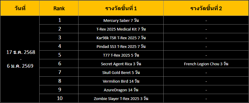 ======================= กิจกรรม Rank Up Event! ระยะเวลากิจกรรม : 17 ธันวาคม 2568 - 6 มกราคม 2569 เพียงผู้เล่นเข้าเล่นเกมและเลื่อนยศรับรางวัลสุดพิเศษเพิ่มเติมในช่วง Rank 1 - 10 ได้ดังนี้