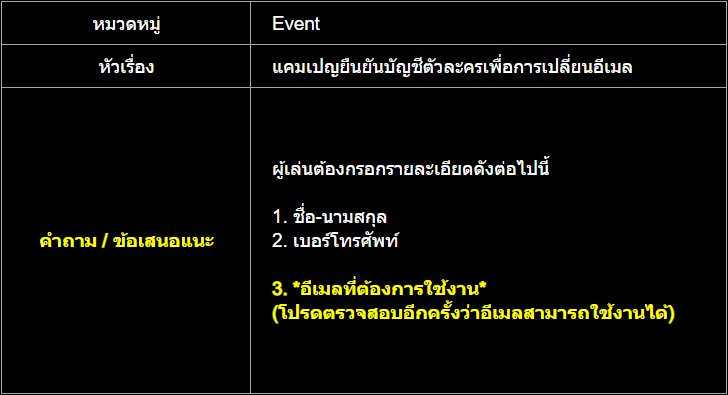 หมายเหตุ: ผู้เล่นสามารถดำเนินการเปลี่ยนอีเมลได้บัญชีละ 1 ครั้งเท่านั้นตลอดระยะเวลากิจกรรม