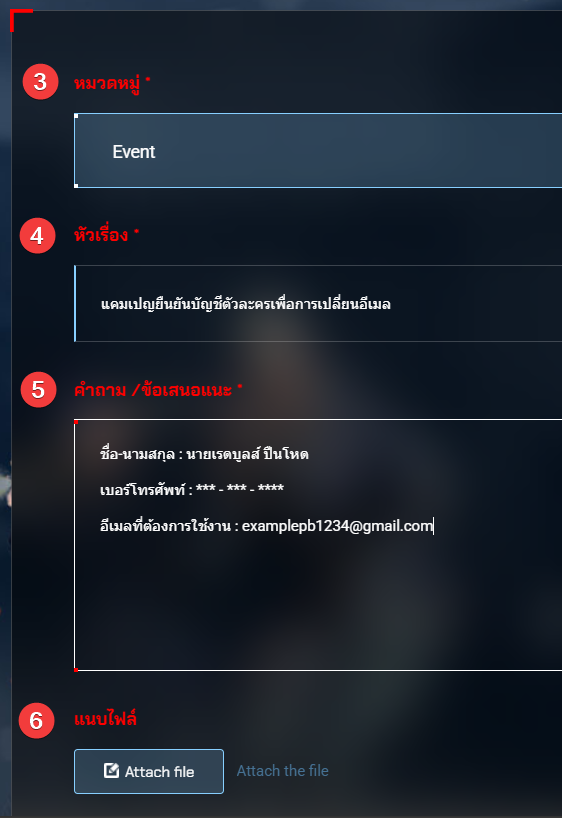 4. กรณีข้อมูลหลักฐานแนบถูกต้องทีมงานจะถือว่าเป็นการร้องขอการดำเนินการของเจ้าของบัญชีตัวละครดังกล่าวและจะดำเนินการเปลี่ยนอีเมลให้