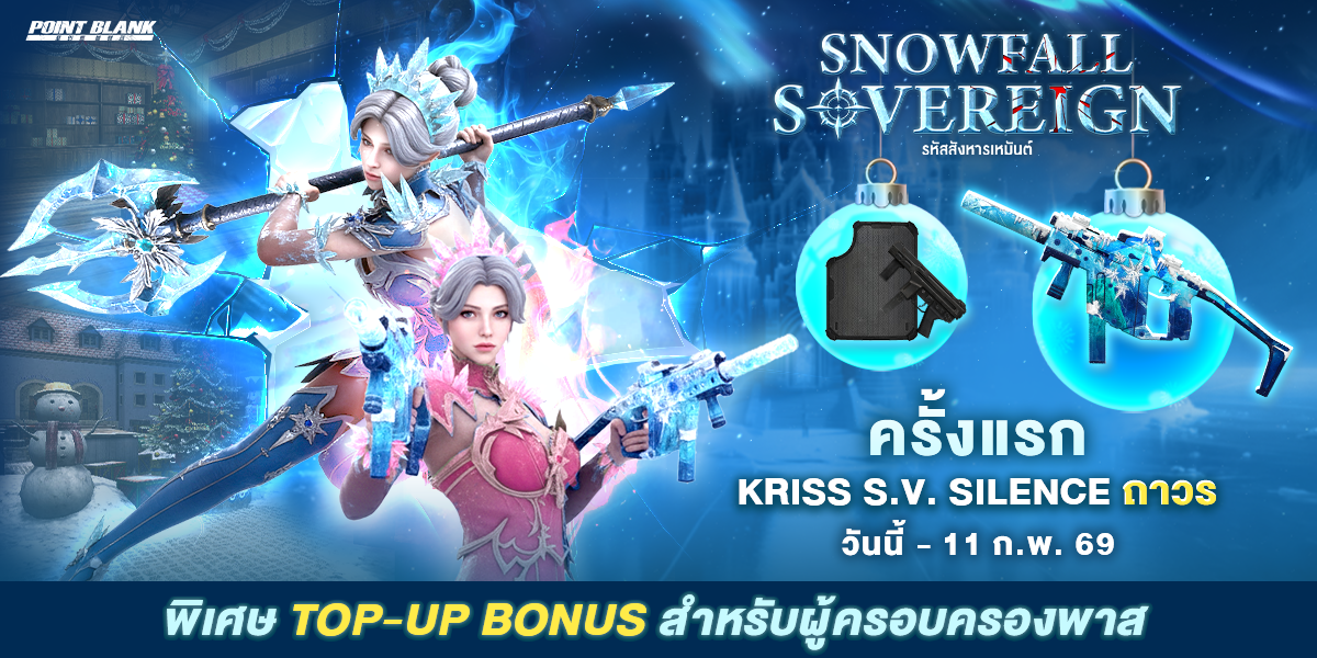 Snowfall Sovereign Weapons Boost สำหรับผู้เล่นที่ใช้งานอาวุธเหล่านี้จะได้รับโบนัสพิเศษ EXP&POINT 200% (ระยะเวลา Boost EXP&Point 150%: 24 - 30 ธันวาคม 2568)