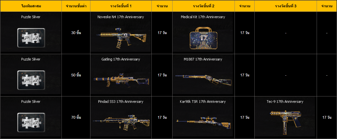 รางวัลจะได้รับตามจำนวน Silver Puzzle ที่สะสมได้ เช่น ผู้เล่นมีจำนวน Silver Puzzle ทั้งหมด 70 ชิ้น ผู้เล่นจะได้รางวัลทั้งหมดตั้งแต่ระดับ 30 ชิ้น จนถึง 70 ชิ้น หมายเหตุ: รางวัลพิเศษจะถูกส่งให้ในกระเป๋าสัมภาระผู้เล่นภายใน 7 วันทำการ ===========================