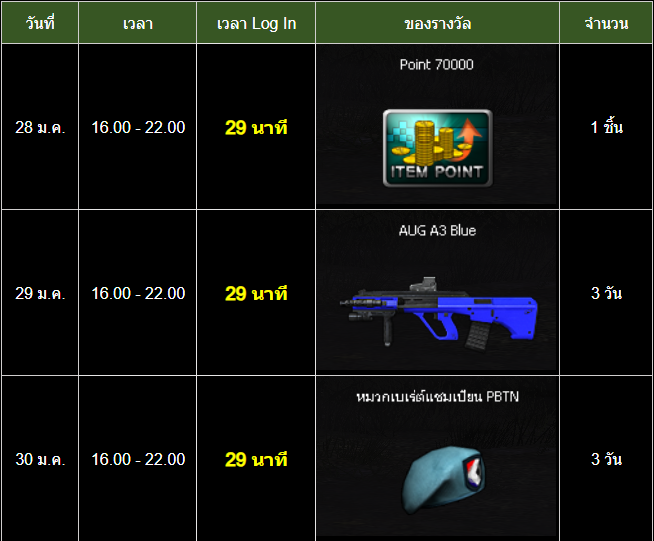 กิจกรรมพิเศษครบรอบ 17 ปี Point Blank! สำหรับผู้เล่นทุกคน เวลากิจกรรม : 21 มกราคม - 24 กุมภาพันธ์ 2569 ขอต้อนรับผู้เล่นทุกท่านสู่กิจกรรมใหญ่ต้นปี 2569 เกม Point Blank ได้เริ่มเปิดให้บริการมานานถึง 17 ปี เปิดประสบการณ์ความสนุกสุดมันส์ให้กับผู้เล่นมายาวนาน พวกเราทีมงานขอขอบคุณผู้เล่นทุกคนที่เป็นส่วนหนึ่งในความสำเร็จ และ ได้เตรียมกิจกรรมสุดพิเศษมากมายให้กับทุกคน ให้ได้ร่วมสนุกตลอดทั้งเดือนกับของรางวัลมากมาย ทั้งนี้ยังมีกิจกรรม สะสมตั๋ว Golden Ticket และ Silver Puzzle เพื่อรับของรางวัลสุดพิเศษ และสิทธิในการลุ้นรับของรางวัลใหญ่เมื่อเก็บสะสมจนครบ! ปุ่มทางลัดกิจกรรม 17 ปี Point Blank เพิ่มเติม! กิจกรรมพิเศษสำหรับผู้เล่นใหม่!! กิจกรรมพิเศษสำหรับผู้เล่นหวนคืน!! รายละเอียดการอัปเดตและกิจกรรม ภารกิจรับ Silver Puzzle - เควสรายวันและรายสัปดาห์ (21 มกราคม - 24 กุมภาพันธ์ 2569) - เควสรายวันพิเศษปลดล็อคด้วย PB Cash (28 มกราคม - 17 กุมภาพันธ์ 2569) - ล็อกอินต่อเนื่อง ครั้งที่ 1 (21 มกราคม - 3 กุมภาพันธ์ 2569) - ล็อกอินต่อเนื่อง ครั้งที่ 2 (4 - 17 กุมภาพันธ์ 2569) ภารกิจรับ Golden Ticket - สะสมเวลาเล่นเกมรายวัน (21 มกราคม - 24 กุมภาพันธ์ 2569) - เควสรายสัปดาห์พิเศษปลดล็อคด้วย PB Cash (4 - 24 กุมภาพันธ์ 2569) กิจกรรมพิเศษ - สะสมเวลาล็อกอิน 1700 วินาที (28 มกราคม - 1 กุมภาพันธ์ 2569) - บูส EXP & Point ตามลำดับยศ (23 มกราคม - 22 กุมภาพันธ์ 2569) รางวัลใหญ่พิเศษสำหรับกิจกรรม 17 ปี - รางวัลพิเศษสำหรับผู้เล่นปัจจุบัน - รายชื่อรางวัลสุดพิเศษเมื่อสะสม Golden Ticket และ Silver Puzzle ครบจำนวน!