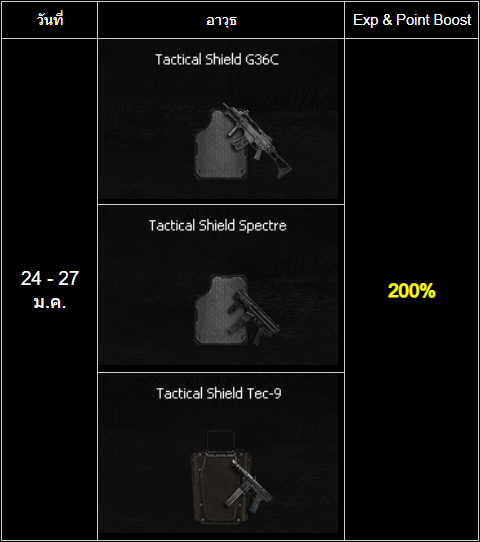 เมื่อเล่นอาวุธประเภท Tactical Shield ตามกำหนดการ รับบูส EXP และ Point เพิ่มเติมสูงสุดถึง 200% ไปเลย