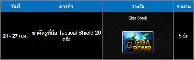 ทำเควสรายวันและรายสัปดาห์สำหรับอาวุธ Tactical Shield รับ Giga Bomb ฟรีเมื่อสำเร็จภารกิจ