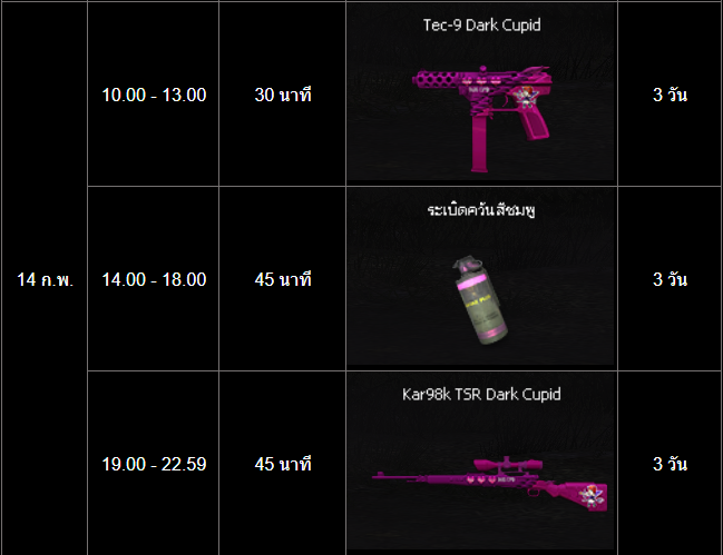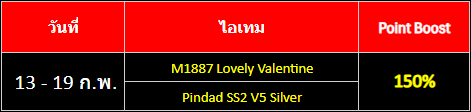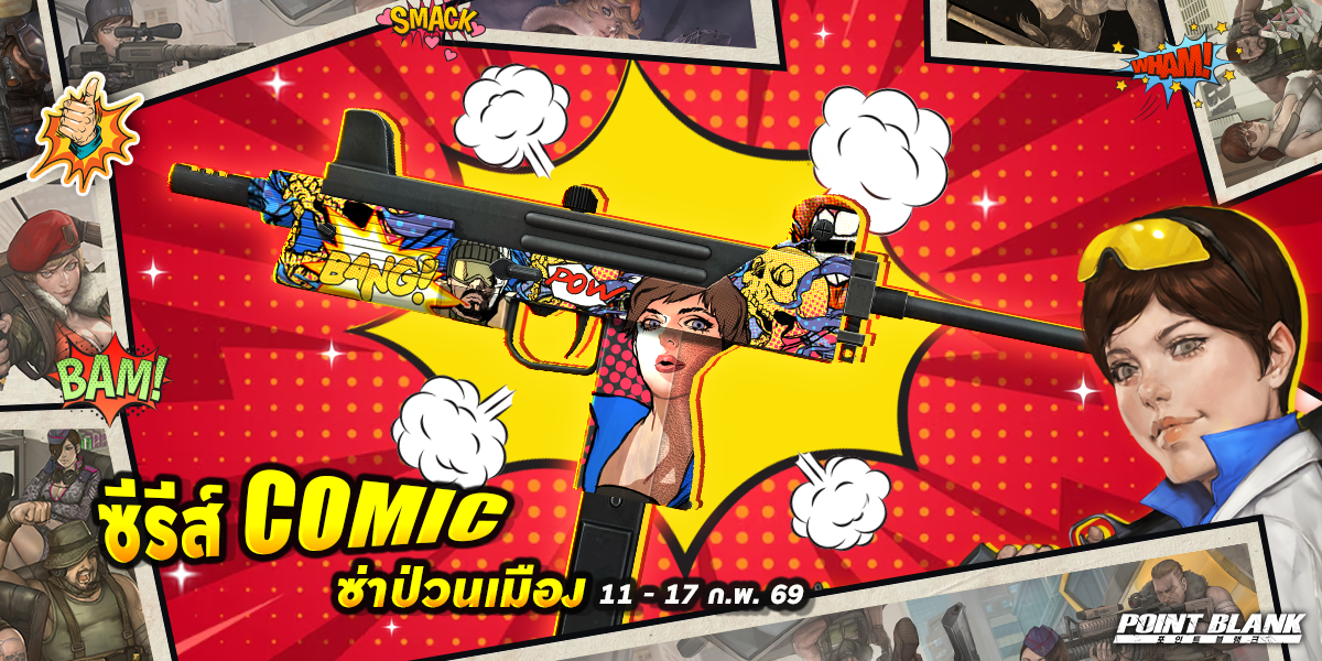 POINT BLANK WEEKLY EVENT UPDATE อัปเดตประจำวันที่ 11 กุมภาพันธ์ 2569 รายละเอียดการอัปเดตประจำสัปดาห์ ไฮไลท์กิจกรรม 2. กิจกรรมครบรอบ 17 ปี พร้อมรางวัลพิเศษมากมาย เริ่มต้นแล้ววันนี้ - 26 กุมภาพันธ์! 3. เปิดโอนย้ายค่ายบัญชีเกมเวลาจำกัด! ตั้งแต่วันนี้ - 3 มีนาคม 2569 เท่านั้น ดูรายละเอียดเพิ่มเติมที่นี่ 4. กิจกรรมวาเลนไทน์ฉลองเทศกาลแห่งความรัก วันนี้ - 17 กุมภาพันธ์นี้เท่านั้น ดูรายละเอียดเพิ่มเติมที่นี่ 5. โบนัสเติมเงินผู้เล่นหวนคืน สูงสุด 100% ตั้งแต่วันนี้ - 24 กุมภาพันธ์นี้เท่านั้น กิจกรรมครบรอบ 17 ปี Point Blank กิจกรรมพิเศษสำหรับผู้เล่นทุกท่าน!! กิจกรรมพิเศษสำหรับผู้เล่นใหม่!! กิจกรรมพิเศษสำหรับผู้เล่นหวนคืน!! อัปเดตระบบภายในเกม - แก้ไขปัญหาการแสดงหน้าต่างข้อความแจ้งเตือนเมื่อสำเร็จภารกิจ Mission Card กิจกรรมใหม่ภายในเกม อัปเดต กิจกรรม Point Item Sale (13 - 15 กุมภาพันธ์) อัปเดต กิจกรรม สะสมเวลาล็อคอินสุดสัปดาห์ต้อนรับวาเลนไทน์ (13 - 15 กุมภาพันธ์) กิจกรรมที่กำลังดำเนินอยู่ภายในเกม กิจกรรม แจกของรางวัลต้อนรับผู้เล่นใหม่ครบรอบ 17 ปี Point Blank รอบที่ 2! (4 - 24 กุมภาพันธ์) กิจกรรม เควสรายวันพิเศษปลดล็อคด้วย PB Cash (28 มกราคม - 17 กุมภาพันธ์) กิจกรรม ล็อกอินต่อเนื่องครบรอบ 17 ปี ครั้งที่ 2 (4 - 17 กุมภาพันธ์) กิจกรรม เควสรายสัปดาห์พิเศษปลดล็อคด้วย PB Cash (4 - 24 กุมภาพันธ์) กิจกรรม ล็อกอินต่อเนื่องรับไอเทมถาวร ครบรอบ 17 ปี (21 มกราคม - 24 กุมภาพันธ์) ![]() Special Item Set สำหรับผู้เล่น Rank 22 - 56 เท่านั้น ระยะเวลาจำหน่าย: 11 - 24 กุมภาพันธ์ 2569 ลดราคาสูงสุด 50% *สามารถซื้อได้เซ็ตละ 1 ครั้งภายใน 24 ชั่วโมงหลังจากล็อกอินเข้าเกมเท่านั้น เวลาจะนับถอยหลังตามเวลาเล่นเกม ![]() ![]() ![]() ![]() Comic ซีรีส์ ระยะเวลาเปิดจำหน่ายตั้งแต่วันที่ : 11 - 24 กุมภาพันธ์ (ไอเทมจะทำการเปิดจำหน่ายจนถึงระยะเวลาก่อนปิดปรับปรุงเซิร์ฟเวอร์) "พิเศษโบนัส 150% EXP & Point เมื่อใช้อาวุธหลักของซีรีส์" ![]() ![]() ![]() ==========================