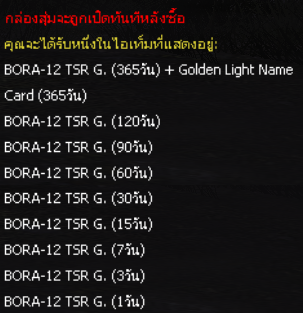 กล่องสุ่ม BORA-12 TSR Gold Focus Box ระยะเวลาเปิดจำหน่ายตั้งแต่วันที่ : 11 - 24 กุมภาพันธ์ (ไอเทมจะทำการเปิดจำหน่ายจนถึงระยะเวลาก่อนปิดปรับปรุงเซิร์ฟเวอร์)