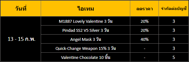 กิจกรรม สะสมเวลาล็อคอินสุดสัปดาห์ต้อนรับวาเลนไทน์ ระยะเวลากิจกรรม : 13 - 15 กุมภาพันธ์ 2569 เพียงเข้าเกมและสะสมเวลาออนไลน์ให้ครบตามที่กำหนดเวลาในช่วง "ระยะเวลากิจกรรม" เพื่อรับรางวัลดังต่อไปนี้