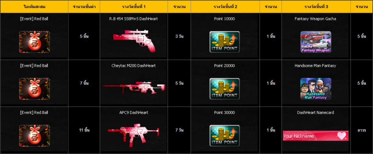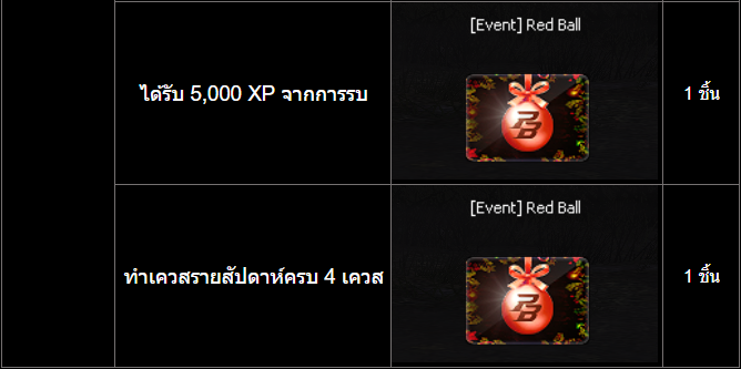 รางวัลจะได้รับสะสมตามจำนวน Red Ball ที่เก็บได้ เช่น ผู้เล่นมีจำนวน Red Ball ทั้งหมด 11 ชิ้น ผู้เล่นจะได้รางวัลทั้งหมดตั้งแต่ระดับ 5 ชิ้น จนถึง 11 ชิ้น หมายเหตุ: รางวัลพิเศษจะถูกส่งให้ในกระเป๋าสัมภาระผู้เล่นภายใน 7 วันทำการ ===========================