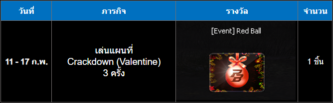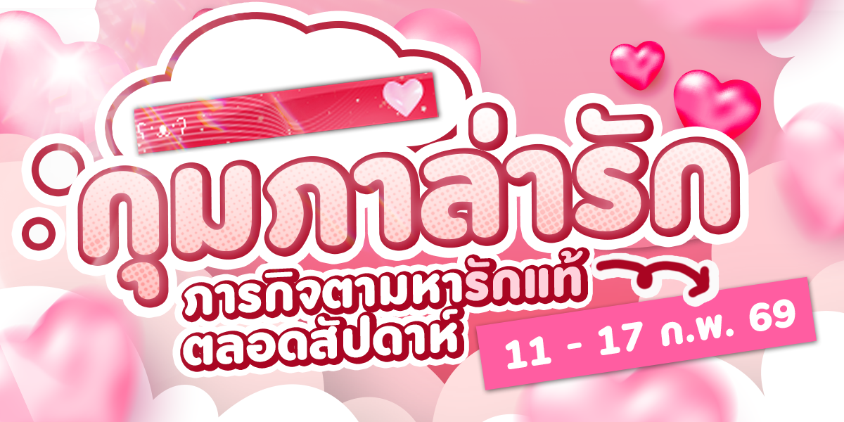 เทศกาลพิเศษช่วงวาเลนไทน์ เวลากิจกรรม : 11 - 17 กุมภาพันธ์ 2569 💘 เทศกาลแห่งความรักมาถึงแล้ว! พร้อมกิจกรรมสะสม Red Ball 💘 ร่วมสนุกกับกิจกรรมวาเลนไทน์ประจำปีนี้ พร้อมลุ้นรับรางวัลใหญ่! สะสม Red Ball ให้ครบตามเงื่อนไขในระยะเวลากิจกรรม รับรางวัลพิเศษหลังจบกิจกรรม ระบบจะมอบของรางวัลเพิ่มเติมให้กับผู้เล่นที่สะสมครบตามกำหนด ยิ่งสะสมมาก ยิ่งมีสิทธิ์รับรางวัลสุด Exclusive มากกว่าเดิม!" รายละเอียดการอัปเดตและกิจกรรม ภารกิจรับ Red Ball - เควสรายวันและรายสัปดาห์ (11 - 17 กุมภาพันธ์ 2569) กิจกรรมพิเศษ - Mission Card: Valentine! (11 - 17 กุมภาพันธ์ 2569) - ล็อกอินรับวาเลนไทน์ (13 - 15 กุมภาพันธ์ 2569) - สะสมเวลาล็อกอินต้อนรับวาเลนไทน์ (13 - 15 กุมภาพันธ์ 2569) - บูส EXP & Point บนแผนที่ธีมวาเลนไทน์ (13 - 15 กุมภาพันธ์ 2569) รางวัลใหญ่พิเศษสำหรับกิจกรรม 17 ปี - รายชื่อรางวัลสุดพิเศษเมื่อสะสม Red Ball ครบจำนวน!