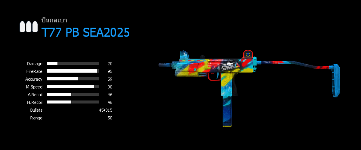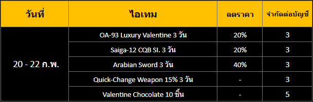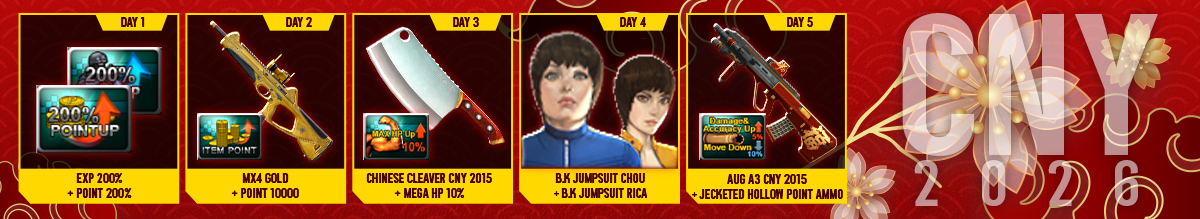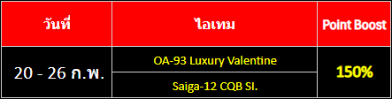 POINT BLANK WEEKLY EVENT UPDATE อัปเดตประจำวันที่ 18 กุมภาพันธ์ 2569 รายละเอียดการอัปเดตประจำสัปดาห์ ไฮไลท์กิจกรรม 2. เปิดโอนย้ายค่ายบัญชีเกมพิเศษ! เวลาจำกัดตั้งแต่วันนี้ - 3 มีนาคม 2569 เท่านั้น ดูรายละเอียดเพิ่มเติมที่นี่ 4. เปิดจอง Season Pass: PBIC2026 Shaman ล่วงหน้า!! รับ PBIC Token ทันที 250 Token! ดูรายละเอียดเพิ่มเติมที่นี่ กิจกรรมครบรอบ 17 ปี Point Blank กิจกรรมพิเศษสำหรับผู้เล่นทุกท่าน!! กิจกรรมพิเศษสำหรับผู้เล่นใหม่!! กิจกรรมพิเศษสำหรับผู้เล่นหวนคืน!! กิจกรรมใหม่ภายในเกม อัปเดต กิจกรรม Point Item Sale (20 - 22 กุมภาพันธ์) อัปเดต กิจกรรม สะสมเวลาล็อคอินสุดสัปดาห์ต้อนรับตรุษจีน (20 - 22 กุมภาพันธ์) อัปเดต กิจกรรม ล็อกอินต่อเนื่องเทศกาลตรุษจีน (18 - 24 กุมภาพันธ์) กิจกรรมที่กำลังดำเนินอยู่ภายในเกม กิจกรรม แจกของรางวัลต้อนรับผู้เล่นใหม่ครบรอบ 17 ปี Point Blank (14 มกราคม - 24 กุมภาพันธ์) กิจกรรม เควสรายสัปดาห์พิเศษปลดล็อคด้วย PB Cash (4 - 24 กุมภาพันธ์) กิจกรรม ล็อกอินต่อเนื่องรับไอเทมถาวร ครบรอบ 17 ปี (21 มกราคม - 24 กุมภาพันธ์) ![]() Special Item Set สำหรับผู้เล่น Rank 22 - 56 เท่านั้น ระยะเวลาจำหน่าย: 11 - 24 กุมภาพันธ์ 2569 ลดราคาสูงสุด 50% *สามารถซื้อได้เซ็ตละ 1 ครั้งภายใน 24 ชั่วโมงหลังจากล็อกอินเข้าเกมเท่านั้น เวลาจะนับถอยหลังตามเวลาเล่นเกม ![]() ![]() ![]() ![]() PB SEA2025 ซีรีส์ ระยะเวลาเปิดจำหน่ายตั้งแต่วันที่ : 18 กุมภาพันธ์ - 3 มีนาคม (ไอเทมจะทำการเปิดจำหน่ายจนถึงระยะเวลาก่อนปิดปรับปรุงเซิร์ฟเวอร์) "พิเศษโบนัส 150% EXP & Point เมื่อใช้อาวุธหลักของซีรีส์" ![]() ![]() ![]() ==========================