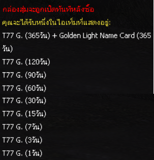 กล่องสุ่ม T77 Gold Focus Box ระยะเวลาเปิดจำหน่ายตั้งแต่วันที่ : 18 กุมภาพันธ์ - 3 มีนาคม (ไอเทมจะทำการเปิดจำหน่ายจนถึงระยะเวลาก่อนปิดปรับปรุงเซิร์ฟเวอร์)
