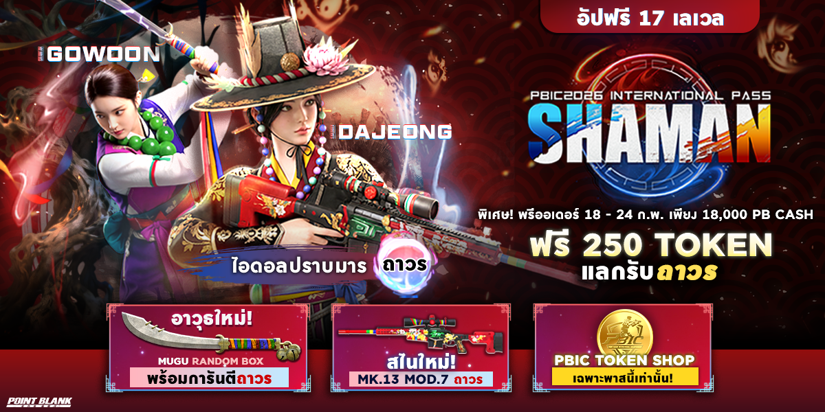 ราคา 18,000 PB CASH! * ตลอดทั้ง Season Pass สามารถใช้สิทธิ์ Pre-order ได้เพียง 1 ครั้งเท่านั้น หากมีการครอบครองเกิน 1 ครั้ง หรือไม่ได้ใช้งานภายในซีซั่นนั้น สิทธิ์ดังกล่าวจะ ไม่สามารถนำไปใช้ใน Season Pass ถัดไป และ ไม่สามารถแลกคืนเป็น PB Cash ได้ พิเศษ! เฉพาะ PBIC2026 International Pass : Shaman เท่านั้น เมื่อพรีออเดอร์วันนี้ รับฟรี! 250 Token สำหรับใช้แลกรับไอเทมใน PBIC Token Shop พร้อมอัปทันที 17 เลเวล (Season EXP Up 1,000) เมื่อเปิดซีซันอย่างเป็นทางการ สิทธิประโยชน์ Season Pass: PBIC2026 เพื่อรับ PBIC Token