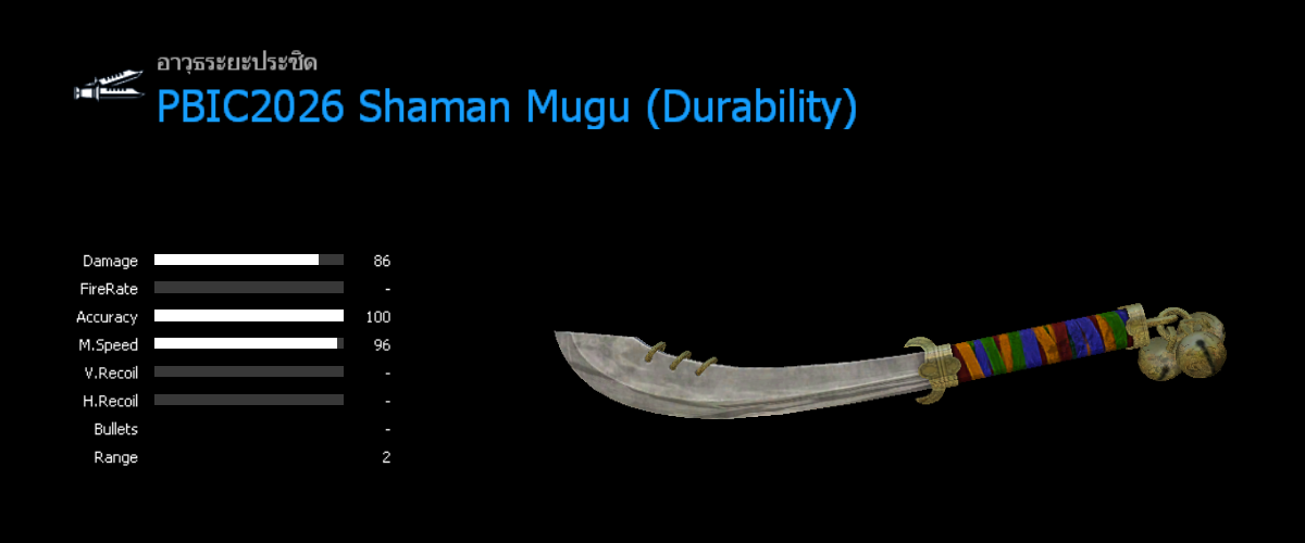 [Mk.13 Mod.7 PBIC2026 Shaman (ถาวร) จะได้รับจาก Season Pass Premium Level 45] อาวุธประชิด : PBIC2026 Shaman Mugu (ถาวร) - แบบถาวรและแบบจำกัดเวลา สามารถสุ่มได้จาก Random Box (การันตีถาวร 100%) เริ่มเปิดขายวันที่ 25 กุมภาพันธ์ - 15 เมษายน 2569 ในร้านค้า Season Pass เลเวล 1
