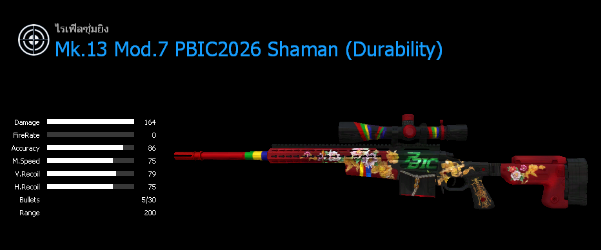 อาวุธหลัก : Mk.13 Mod.7 PBIC2026 Shaman (ถาวร) เงื่อนไขการครอบครอง: ของรางวัลระดับ Premium ที่ Season Pass เลเวล 45