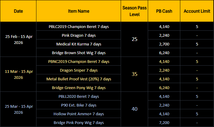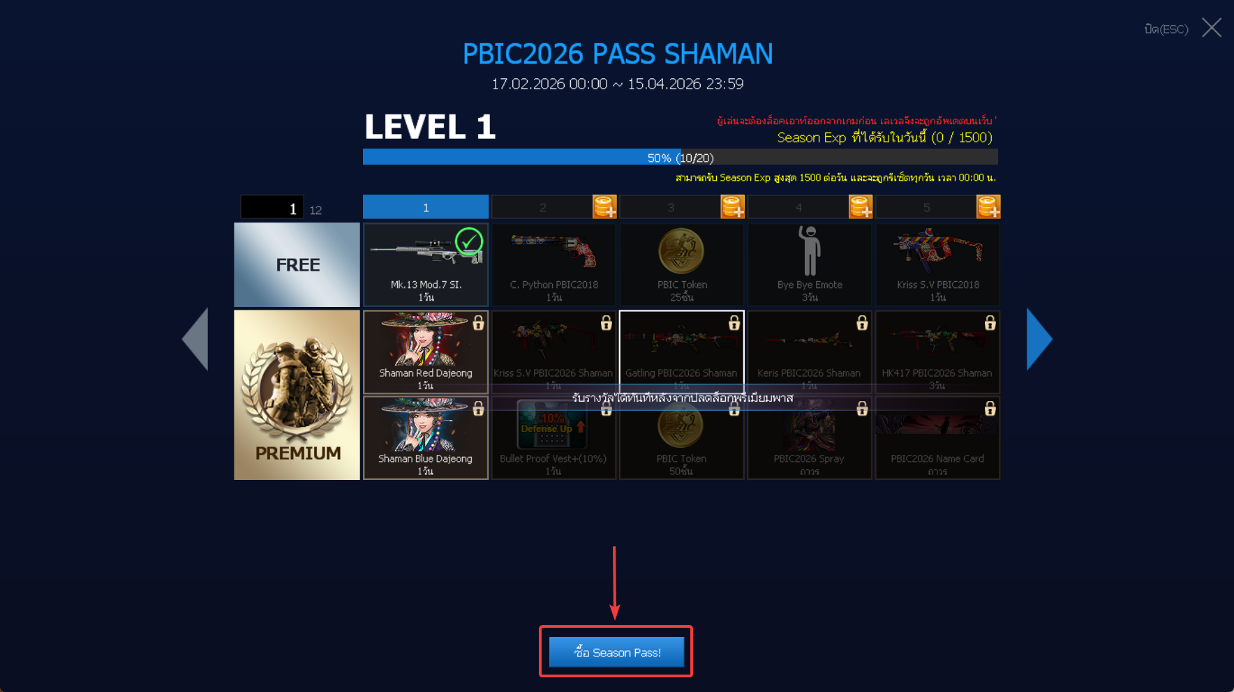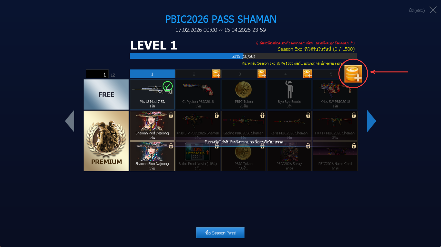 PBIC2026 INTERNATIONAL PASS : SHAMAN ระยะเวลาซีซั่นพาส: 25 กุมภาพันธ์ - 15 เมษายน 2569 เงื่อนไขเข้าร่วม Season Pass 1. สะสม Season EXP ตามที่กำหนดเพื่อปลดล็อกระดับ Season Pass เพื่อเพิ่มรางวัลพรีเมี่ยมของคุณ 2. ยิ่งระดับ Season Pass สูงเท่าไร ก็จะยิ่งได้รับของพรีเมี่ยมมากขึ้นเท่านั้น 3. ผู้เล่นทุกคนสามารถได้รับของรางวัลจาก Season Pass ได้ฟรีที่ช่องของรางวัลแถบ Free Reward 4. สำหรับรางวัลพรีเมียม ผู้เล่นจะต้องปลดล็อกด้วย 18,000 PB Cash เพื่อรับรางวัลพรีเมี่ยมอีกมากมาย!!! 5. Season EXP จากแมตช์ปกติจะถูกจำกัดอยู่ที่ 1,500 EXP ต่อวัน ( รีเซ็ตเวลา 00.00 น. ) 6. เมื่อระยะเวลา Season Pass สิ้นสุดลง ผู้เล่นทุกคนจะไม่สามารถเพิ่มเลเวล Season Pass ได้ 7. เมื่อผู้เล่นถึงระดับ Season Pass ที่กำหนด ร้านค้าจะปลดล็อกไอเทมหายากใน Season Pass Premium Shop คู่มือปลดล็อกของรางวัลพรีเมียม ![]() เงื่อนไขการอัพเลเวล Season Pass การอัพเลเวล Season Pass สามารถรับได้ทั้งหมด 3 วิธี ดังนี้ 1. จากการเข้าเล่นเกมปกติ โดยจะได้รับ Season Pass EXP ซึ่งเป็นจำนวน 10% ของ EXP ที่ได้รับจากการเล่นเกม แต่ละแมทช์ 1.1 ผู้เล่นจะได้รับ Season Pass EXP จากการเข้าเล่นปกติได้ ลิมิตสูงสุด 1,500 Season EXP ต่อวันเท่านั้น ( รีเซทเวลา 00.00 น.) 1.2 สามารถใช้งานไอเทม Season EXP Boost เพื่อเร่งอัตราการได้รับ Season EXP ได้ 2. จากการทำภารกิจ Quest System โดยในช่วงระยะเวลา Season Pass จะมีภารกิจ Quest system รายวันซึ่งจะมีรางวัลเป็น Season EXP Boost 2.1 จำเป็นต้องกดใช้ไอเทม Season EXP Boost ภายในคลัง เพื่อเพิ่มเลเวลของ Season Pass ตนเอง 2.2 Season EXP ที่ได้รับจากการใช้งานไอเทม Season EXP Boost จะไม่ถูกจำกัดลิมิตตามข้อ 1.1 2.3 การทำเควสประจำวันและเควสประจำสัปดาห์สำเร็จจะได้รับ Season Exp อีกด้วย 3. จากการซื้อ Season Pass Level ผู้เล่นสามารถอัพเลเวล Season Pass ได้ด้วย PB CASH สามารถเลือกเลเวลได้ตามที่ต้องการจากหน้าต่าง Season Pass (อัตราส่วน 1 season exp: 20 PB Cash) ทั้งนี้ในแต่ละเลเวลจะใช้จำนวน EXP ที่ต่างกัน 3.1 การซื้อเลเวล Season Pass Level จะไม่ถูกจำกัดลิมิตตามข้อ 1.1 3.2 สามารถซื้อเลเวล Season Pass Level ได้ไม่จำกัด แต่จำเป็นต้องกดซื้อทีละหน้าเท่านั้น === การซื้อ Season Pass Level เพิ่มขึ้น ==== ผู้เล่นสามารถดำเนินการซื้อเลเวลของ Season Pass ด้วย PB Cash ผ่านหน้าต่าง Season Pass จากภายในเกม ตามภาพประกอบดังนี้ ![]() รูปตัวอย่างการแสดงหน้าต่าง Season Pass จากภายในเกม หลังจากที่ผู้เล่นดำเนินการกดซื้อเลเวลตามภาพด้านบนแล้ว กด "ยอมรับ" เพื่อซื้อเลเวล Season Pass ด้วย PB Cash ตามภาพประกอบด้านล่าง (สามารถซื้อเลเวล Season Pass ได้ครั้งละ 5 เลเวล) ![]() ![]() โบนัส PBIC Token! 🎁 โปรโมชั่นพิเศษ! ซื้อก่อน คุ้มกว่า! สำหรับนักรบที่ซื้อ Premium Pass ระหว่างวันที่ 25 กุมภาพันธ์ - 3 มีนาคม 2569 นี้เท่านั้น! รับโบนัส PBIC Token ทันที 250 Token ![]() รีบด่วน! โอกาสทองในการสะสม Token ให้ถึงเป้าหมายได้ไวกว่าใคร