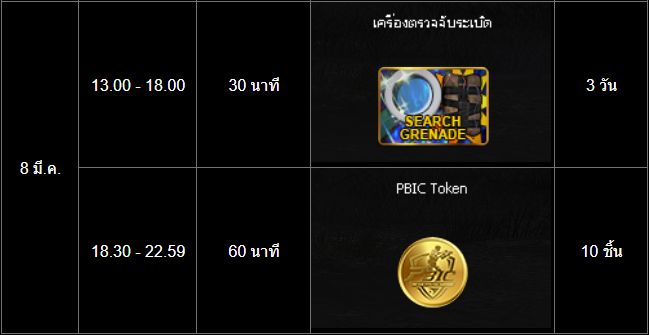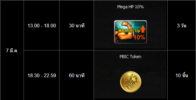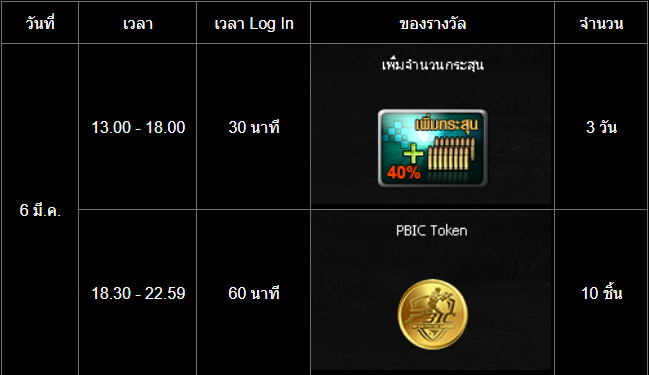 =========================== กิจกรรม สะสมเวลาล็อกอินสุดสัปดาห์ PBIC ระยะเวลากิจกรรม : 6 - 8 มีนาคม 2569 เพียงเข้าเกมและสะสมเวลาออนไลน์ให้ครบตามที่กำหนดเวลาในช่วง "ระยะเวลากิจกรรม" เพื่อรับรางวัลดังต่อไปนี้