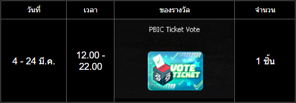 กิจกรรม ล็อกอินสุดสัปดาห์รับ Token PBIC2026 ระยะเวลากิจกรรม : 6 - 8 มีนาคม 2569 แจกหนักจัดเต็มเพื่อเทศกาล PBIC 2026! เพียงล็อกอินเข้าสู่เกมตามวันและเวลาที่กำหนด รับ Token เพิ่มไปเลย ![]() =========================== กิจกรรม ล็อกอินรายวันรับตั๋วโหวต PBIC2026 ระยะเวลากิจกรรม : 4 - 24 มีนาคม 2569 ร่วมเป็นส่วนหนึ่งของการแข่งขันระดับโลก! เพียงเข้าเกมตามเวลาที่กำหนด รับไอเทมไปเลยฟรีๆ ทุกวัน: