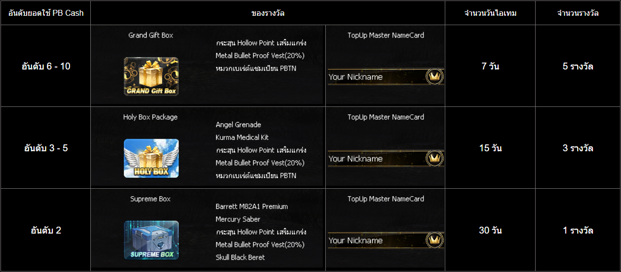 ผู้เล่นที่มียอดการใช้ PB Cash ติดลำดับ Top 10 จากทั้งหมดจะได้รับรางวัลต่างๆดังนี้!