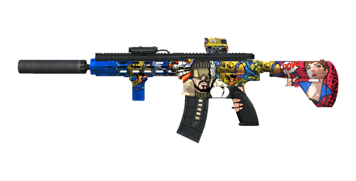 HK416 TBA Comic is a bold and colorful weapon featuring vibrant Pop Art comic designs. With iconic PB characters printed right on the gun, this piece brings extra flair to every battle.