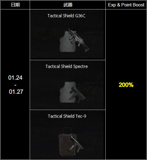 活動期間內使用「Tactical Shield」系列武器進行遊戲,即可享有最高 200% 的 EXP 與 Point 加成!