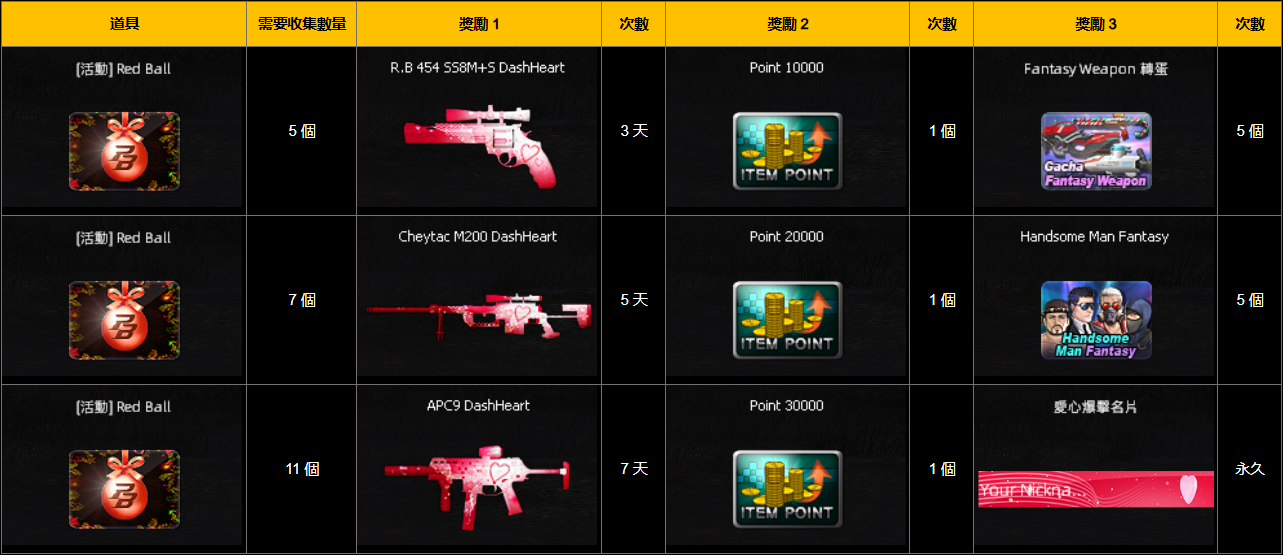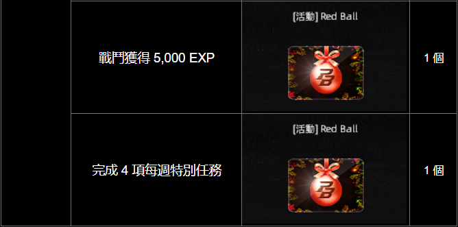 獎勵將根據玩家收集的「Red Ball」數量進行累計發放。 例如:若玩家共持有 11 個「Red Ball」,即可獲得從 5 個至 11 個等級區間內的所有獎勵。 備註:特別獎勵將於活動結束後 7 個工作天內,發送至玩家的個人背包中。 ===========================
