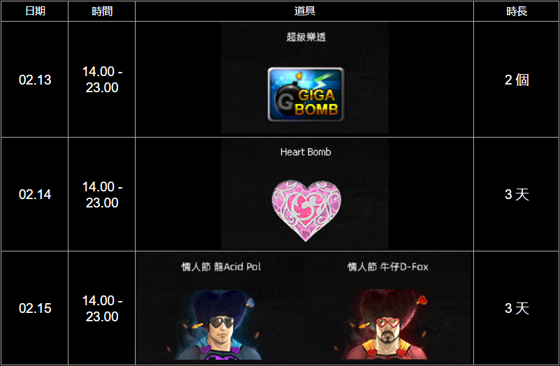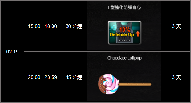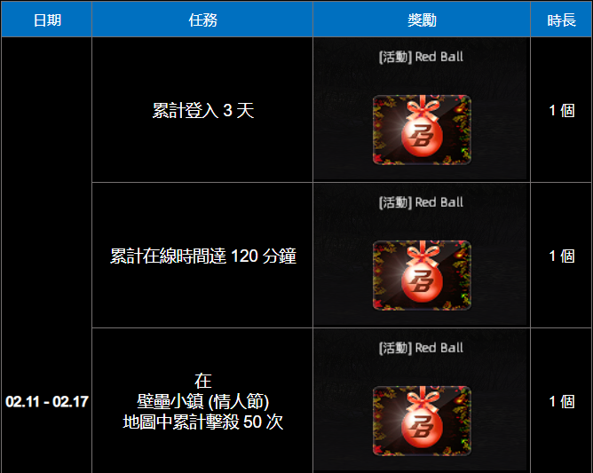 =========================== 情人節累積登入時間活動 活動時間 : 2026.02.13 - 02.15 在「活動期間」內登入遊戲並累積在線時間達指定目標,即可獲得以下獎勵: