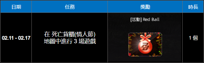 =========================== 情人節主題地圖:EXP & Point 經驗加成 活動時間 : 2026.02.13 - 02.15 週末期間於情人節主題地圖進行遊戲,即可享有最高 200% 的 EXP 與 Point 經驗加成! ![]() =========================== 情人節特別大獎 Red Ball 達標專屬獎勵 凡是收集 Red Ball 達到指定數量的玩家,將在活動結束後獲得特殊限定道具獎勵。