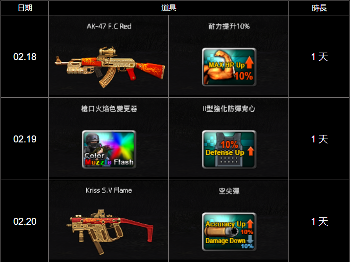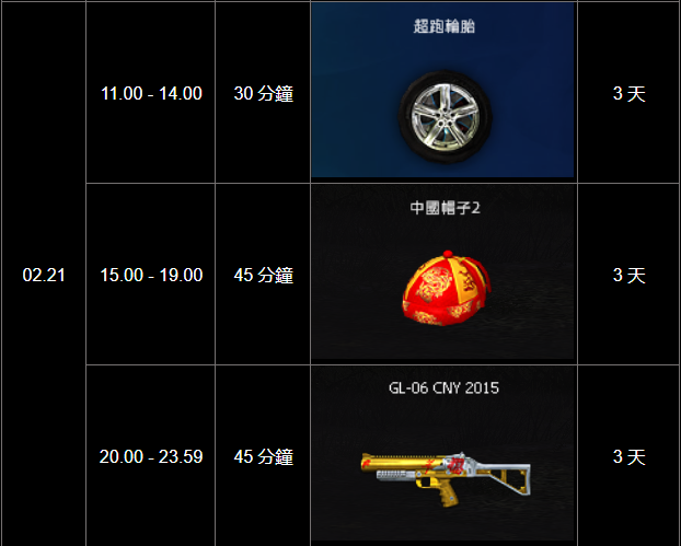 =========================== 農曆新年累計在線活動 活動時間 : 2026.02.20 - 02.22 在「活動期間」內登入遊戲並累積在線時間達指定目標,即可獲得以下獎勵: