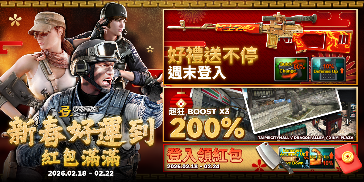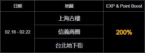 =========================== 農曆新年主題地圖:EXP & Point 經驗加成 活動時間 : 2026.02.18 - 02.22 於活動週末期間,在農曆新年主題地圖中進行遊戲,即可享有高達 200% 的 EXP 和 Point 經驗值加成! ![]() ![]() ===========================