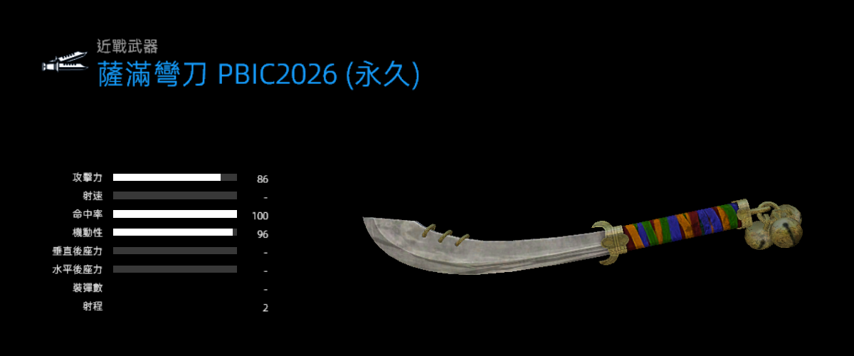 [薩滿 PBIC2026 Mk.13 Mod.7 (永久) 在高級戰鬥通行證 等級45 獲得] 近戰武器:薩滿彎刀 PBIC2026 (永久) 手燈有機會從轉蛋中獲取限時版或永久版 (有保底機制100%獲取) 上架期間:2026.02.18 - 2026.04.15,僅在官網戰鬥通行證商店