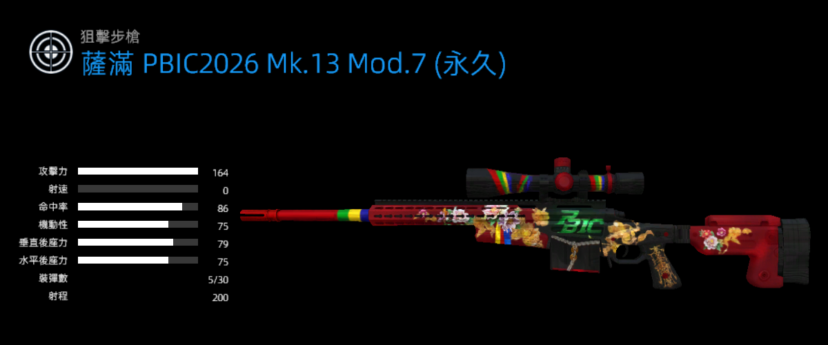亮點道具 戰鬥通行證《薩滿 PBIC2026》 主武器:薩滿 PBIC2026 Mk.13 Mod.7 (永久)